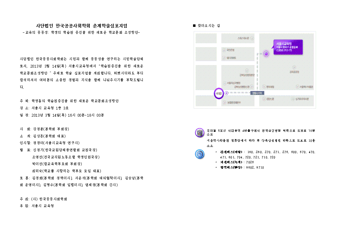 사단법인 한국공공사회학회는 시민과 함께 공공성을 연구하는 시민학술단체로서, 2013년 3월 14일(목) 서울시교육청에서 “학습권증진을 위한 새로운 학교문화조성방안 ” 주제로 학술 심포지엄을 개최합니다. 바쁘시더라도 부디 참석하셔서 여러분의 소중한 경험과 지식을 함께 나눠주시기를 부탁드립니다.